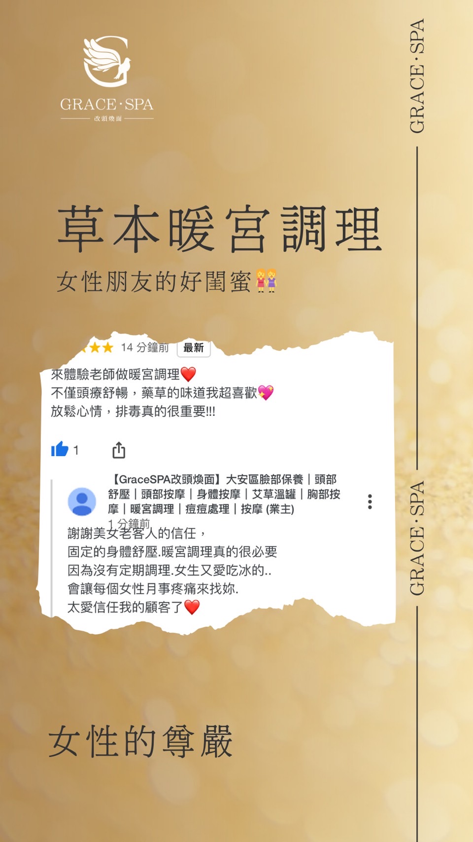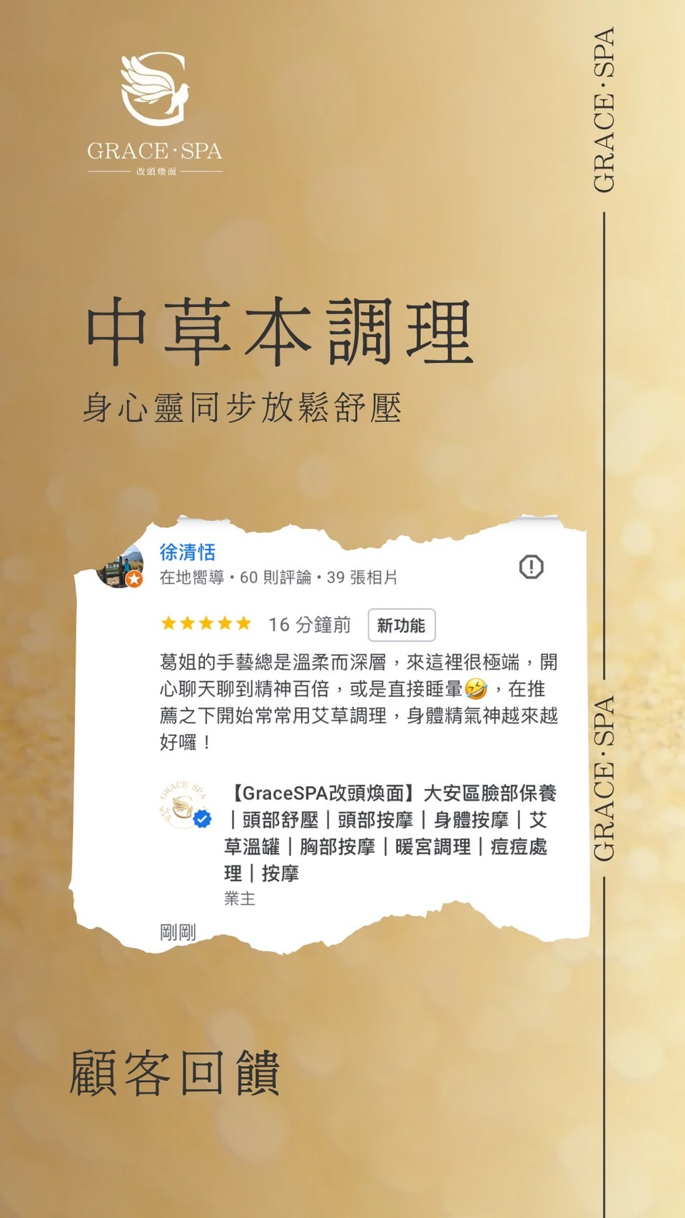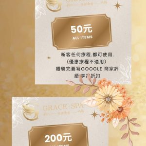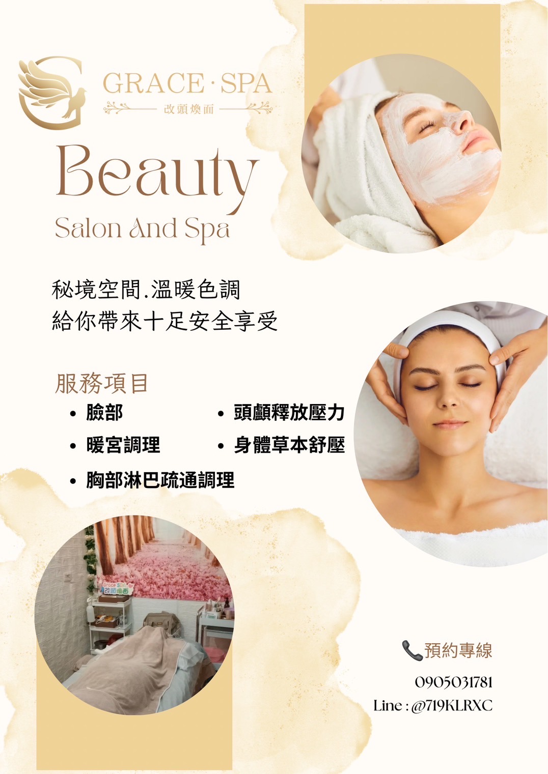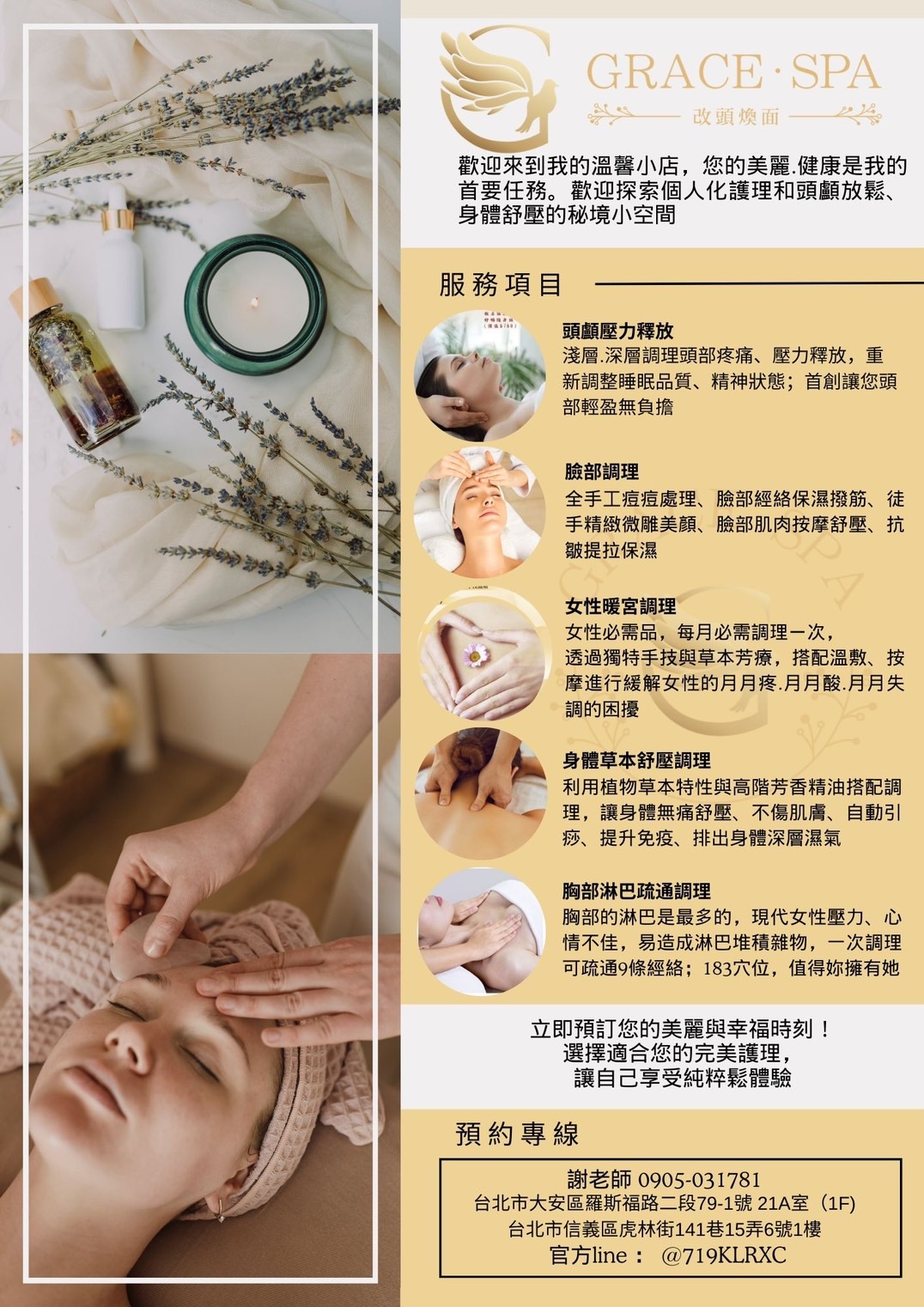 歡迎來到Grace SPA!提供最專業、最貼心的服務,讓您享受健康美麗的生活,堅持著「讓我的專業來,手護您一輩子的健康美麗生活」的理念,為您從頭到腳量身定制、客製化的服務,滿足您的各種需求。我們的服務包括臉部保養、頭部舒壓、頭部按摩、身體按摩、艾草溫罐、胸部按摩、暖宮調理、痘痘處理等,每一項服務都經過精心設計,以確保您得到最好的享受和效果。