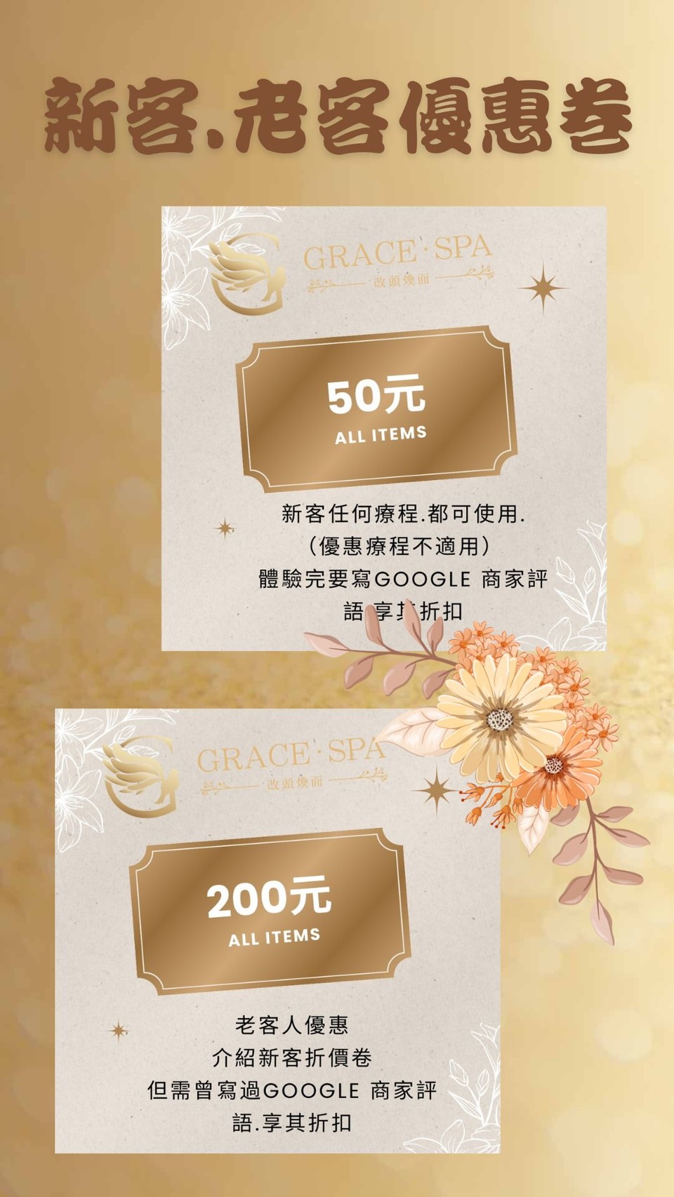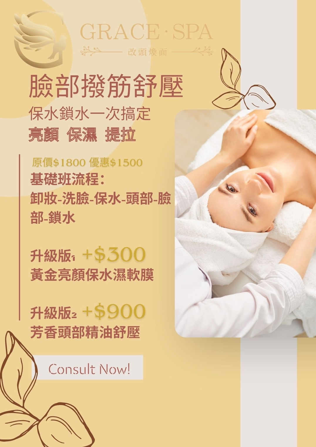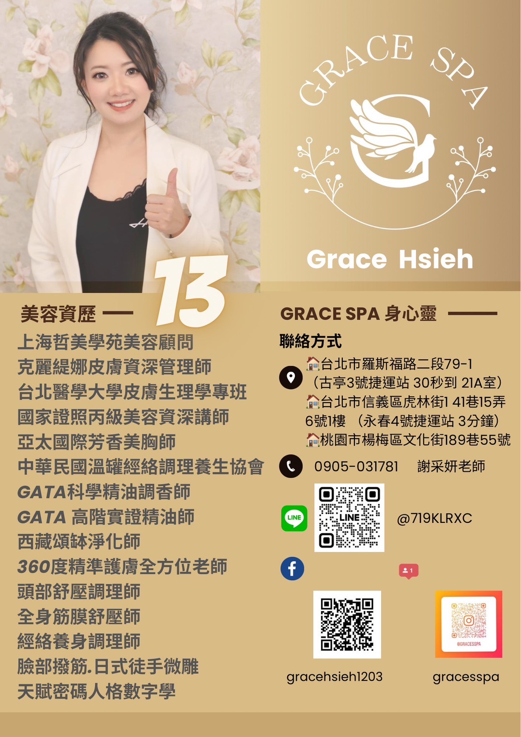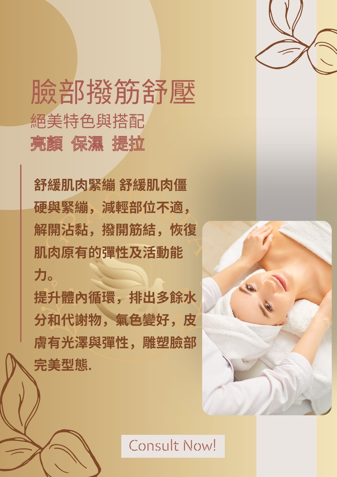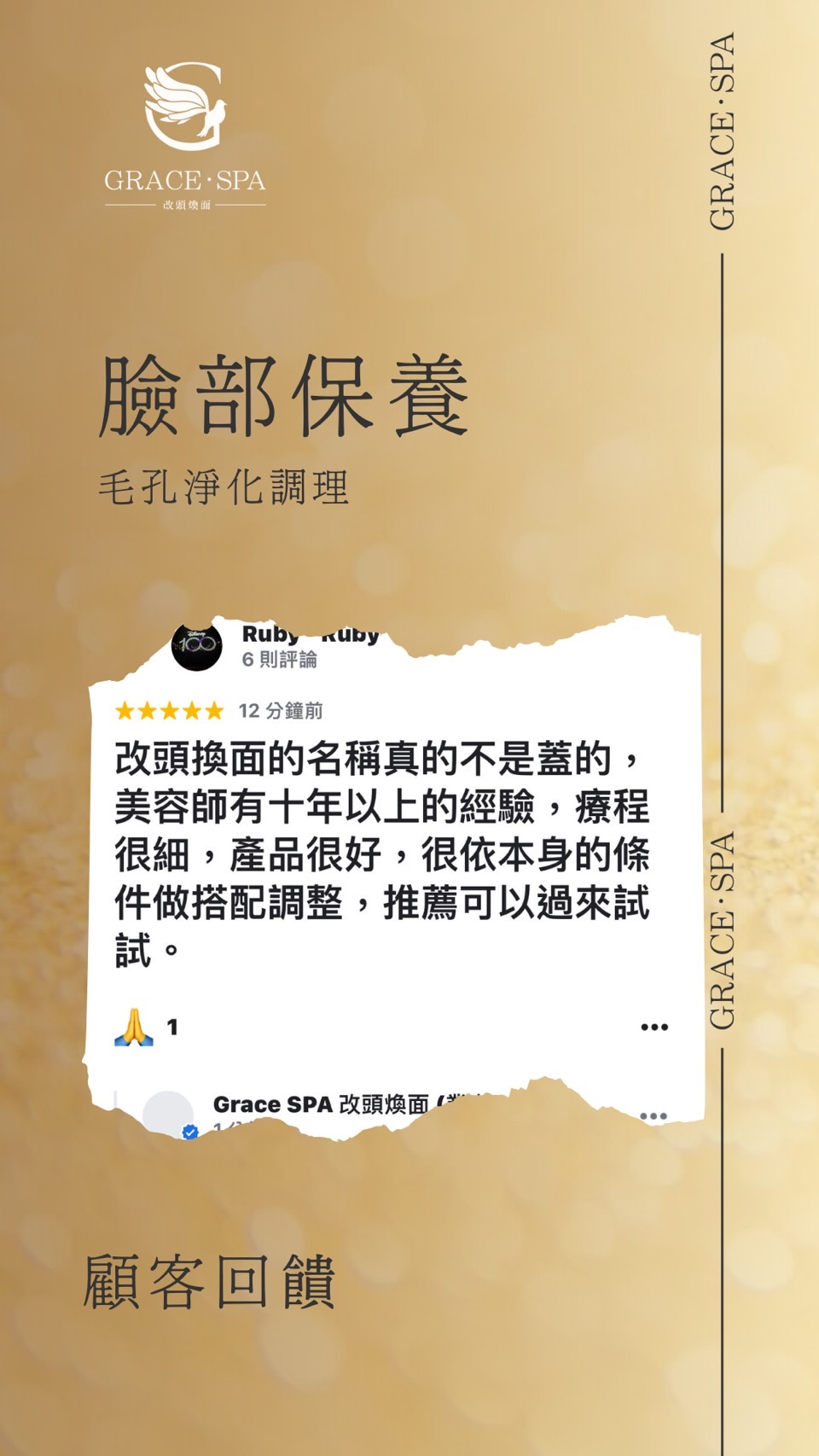 歡迎來到Grace SPA!提供最專業、最貼心的服務,讓您享受健康美麗的生活,堅持著「讓我的專業來,手護您一輩子的健康美麗生活」的理念,為您從頭到腳量身定制、客製化的服務,滿足您的各種需求。我們的服務包括臉部保養、頭部舒壓、頭部按摩、身體按摩、艾草溫罐、胸部按摩、暖宮調理、痘痘處理等,每一項服務都經過精心設計,以確保您得到最好的享受和效果。
